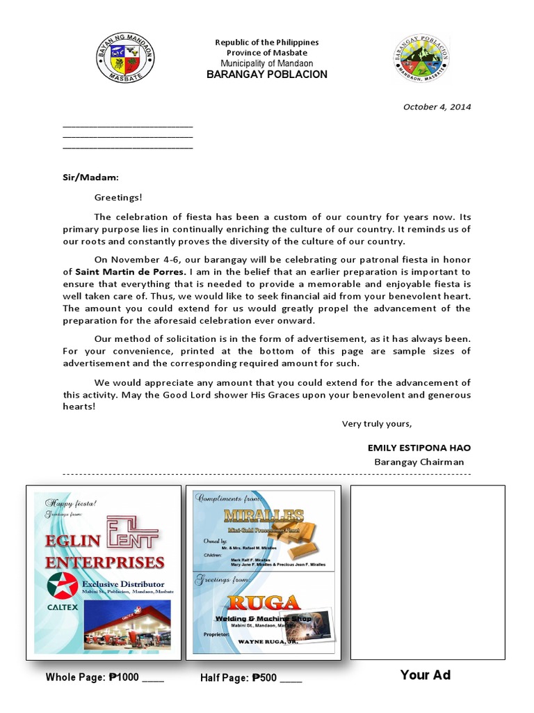 Layout and templates of formal letters. How you want it to appear? A formal solicitation letter is sent when a person, a prospective student, or a nonprofit organization wants to ask for financial aid from someone or from a corporation. You are also familiar with informal and formal letters.
