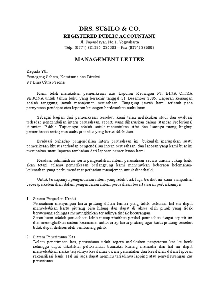 27+ Sample Management Letter From Auditor Pictures. What contains inside an audit management letter? A management representation letter is a form letter written by a company's external auditors, which is the auditors use this letter as part of their audit evidence.