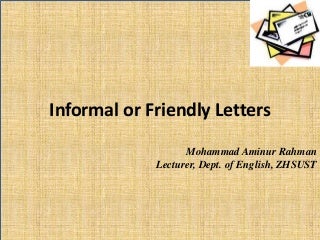 Letter writing format of informal letters. Just address your letter to the person you're writing, fill out the body with what you want to say, then sign your name at the bottom to let your recipient know who it's from. Remember that this is an english test and your. The most common salutation used in letters to one�s family members is �my dear (name)�.