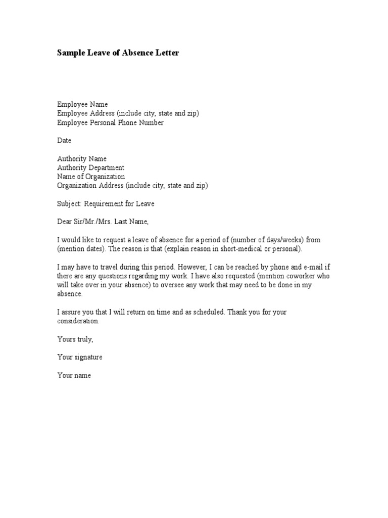 Download Sample Letter Leave Absence Pictures. Leave letters, in general, are written to get permission for a person's absence from office for a stipulated period of time. No matter what your reason for asking for a leave of absence from work, this template can be edited to be specific to your situation.